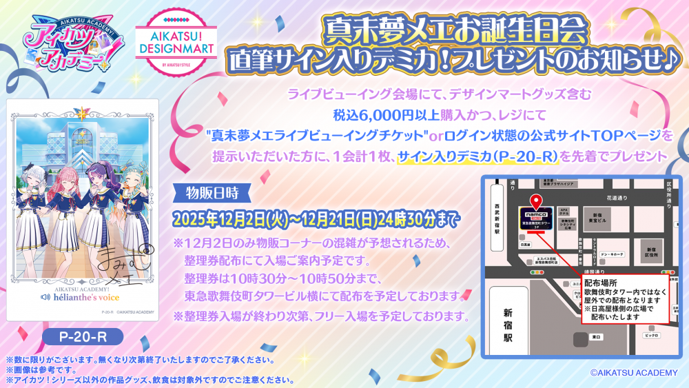 さらに、ライブビューイング会場限定の購入特典として直筆サイン入りデミカ(P-20-R)を配布!